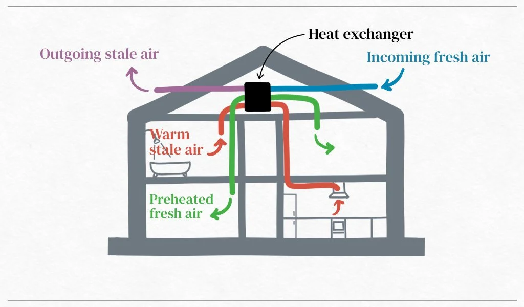 Image: A sketch diagram showing the principles of an MVHR ventilation system, with the heat from warm stale air drawn from the bathrooms and kitchen (red) being transferred to cool fresh air being drawn from the outside (blue). The pre-warmed fresh air (green) is distributed to habitable rooms like living rooms and bedrooms.