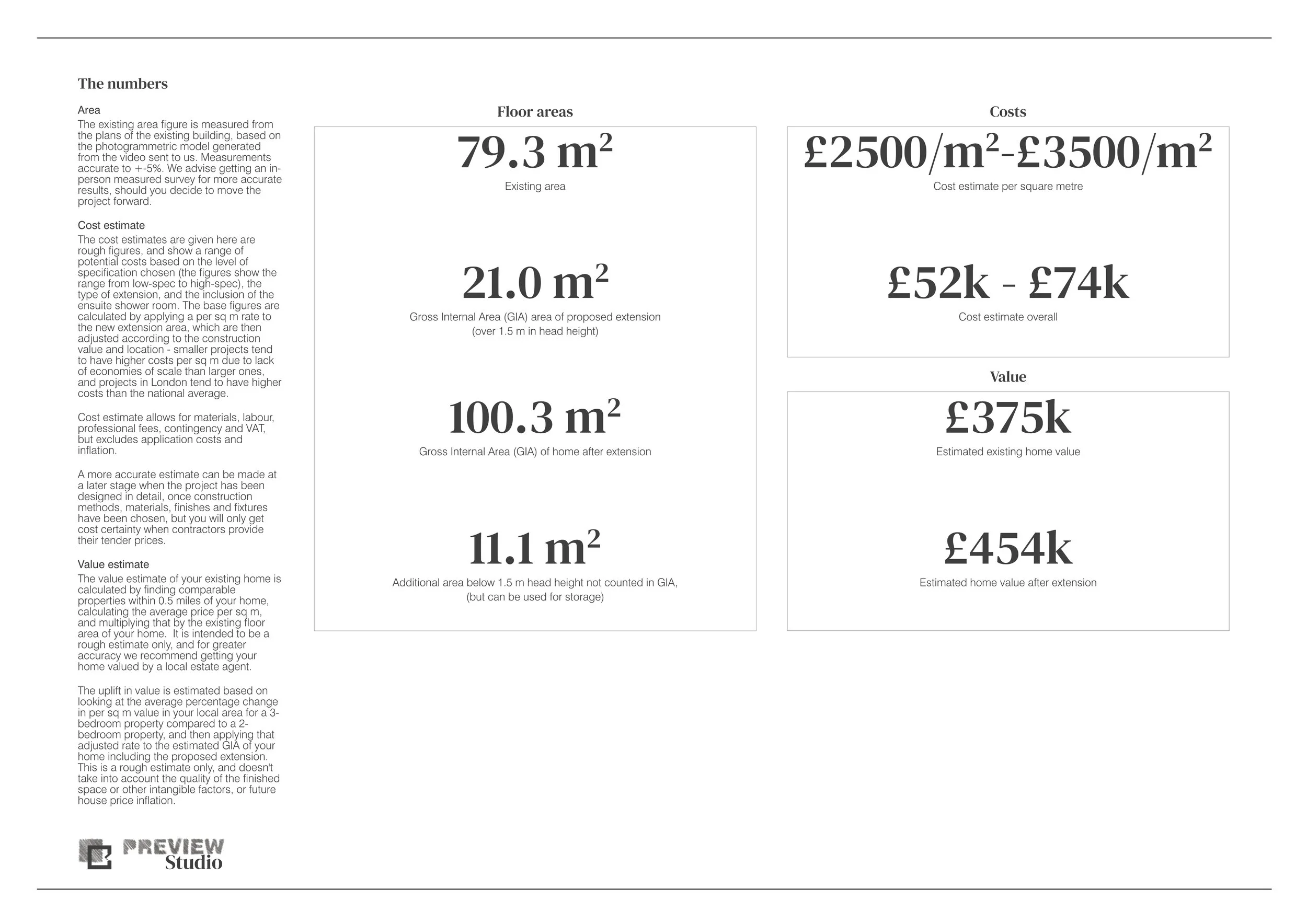 The core Preview Studio pack includes a rough cost estimate for the construction of the proposed extension. For those who are interested in their home as an investment, we will look at comparable properties in the neighbourhood to establish an average value per square metre and apply that to the proposed total area to give you an estimate of the value added by the extension.